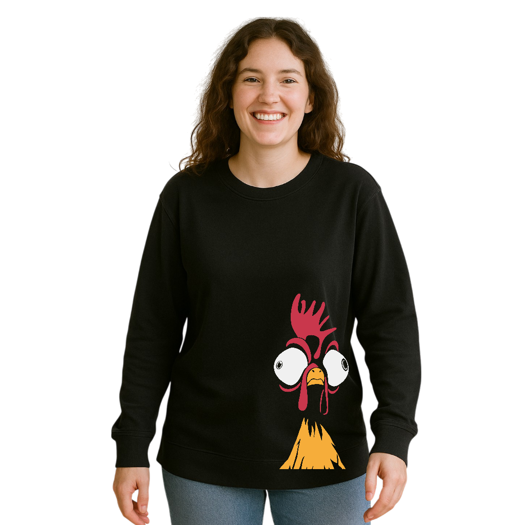 Get ready to ruffle some feathers with our “Cluckin’ Crazy” oversized sweatshirt! Featuring a hilariously shocked chicken graphic peeking up...