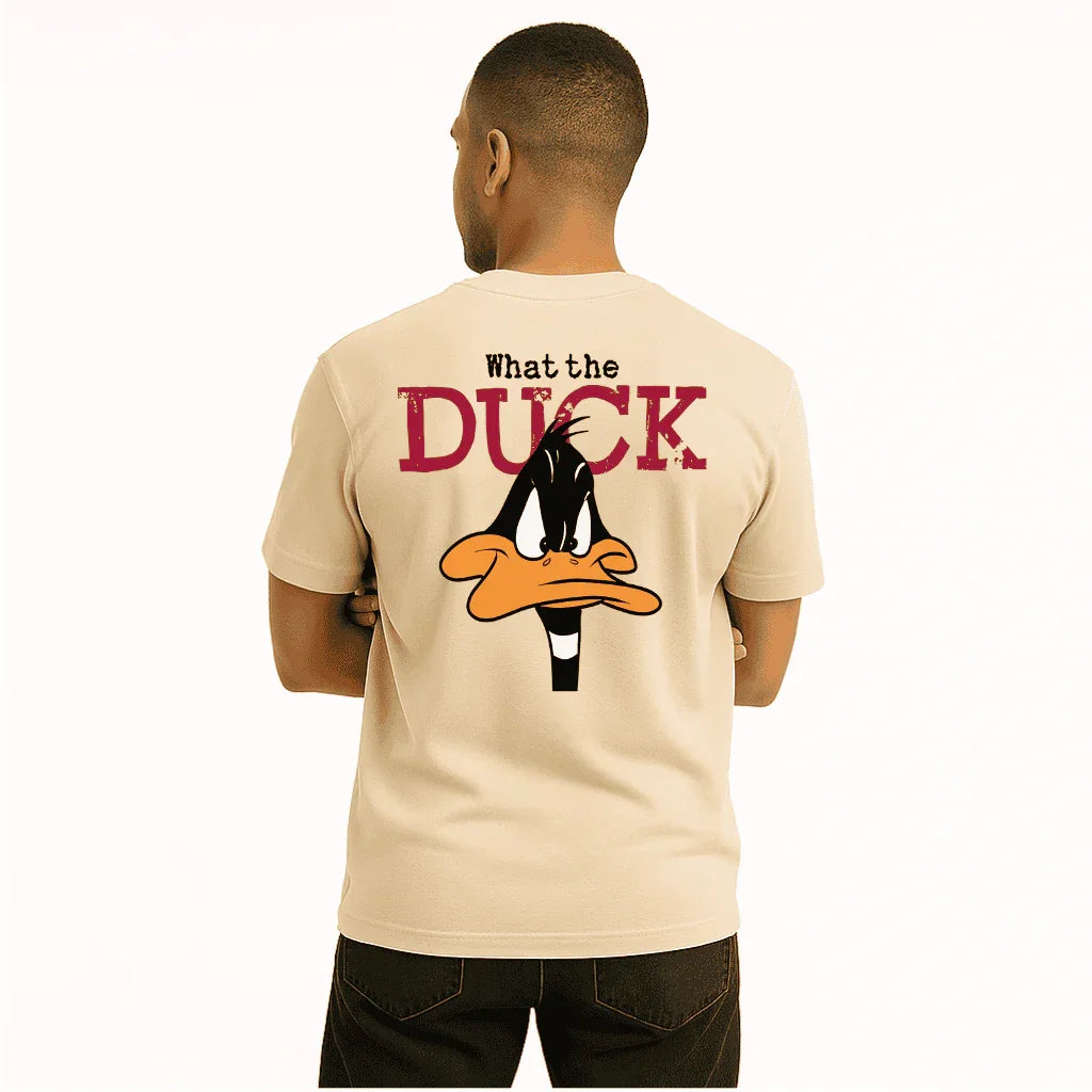 Add some attitude to your outfit with this beige oversized tee featuring the cheeky slogan “What the DUCK” on the...